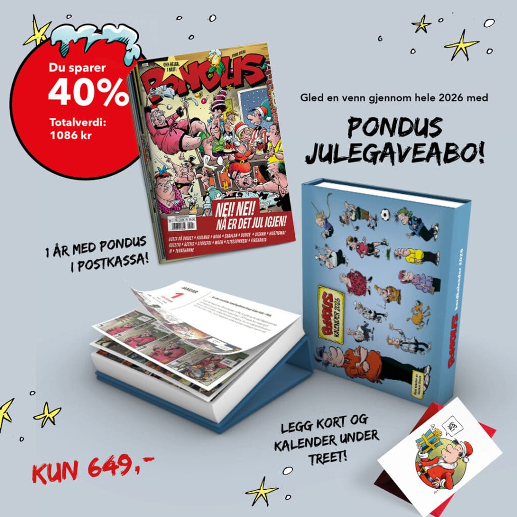 I Pondus blir du kjent med: «Rutetid» av Frode Øverli, «Storefri» og «Hurtigmat» av Marius Henriksen, «Hjalmar» av Nils Axle Kanten, «Gutta på gølvet» av Trond J. Stavås, «Noor» av Noor H. Eckhoff, «Flisespikkeri» av Øyvind Sagåsen, «Dunce» av Jens K. Styve, «Bestis» og «Queering» av Kenneth Larsen og «Skavlan» av Fredrik Skavlan.