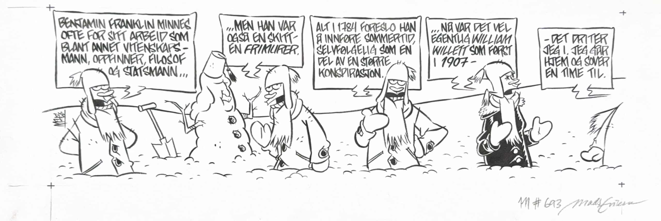 Det er en utsøkt glede å kunne tilby fem Mads Eriksen-originaler til salgs. Her er hvert tusjdrag synlig på papiret, fra den glade analoge tidsalder.
