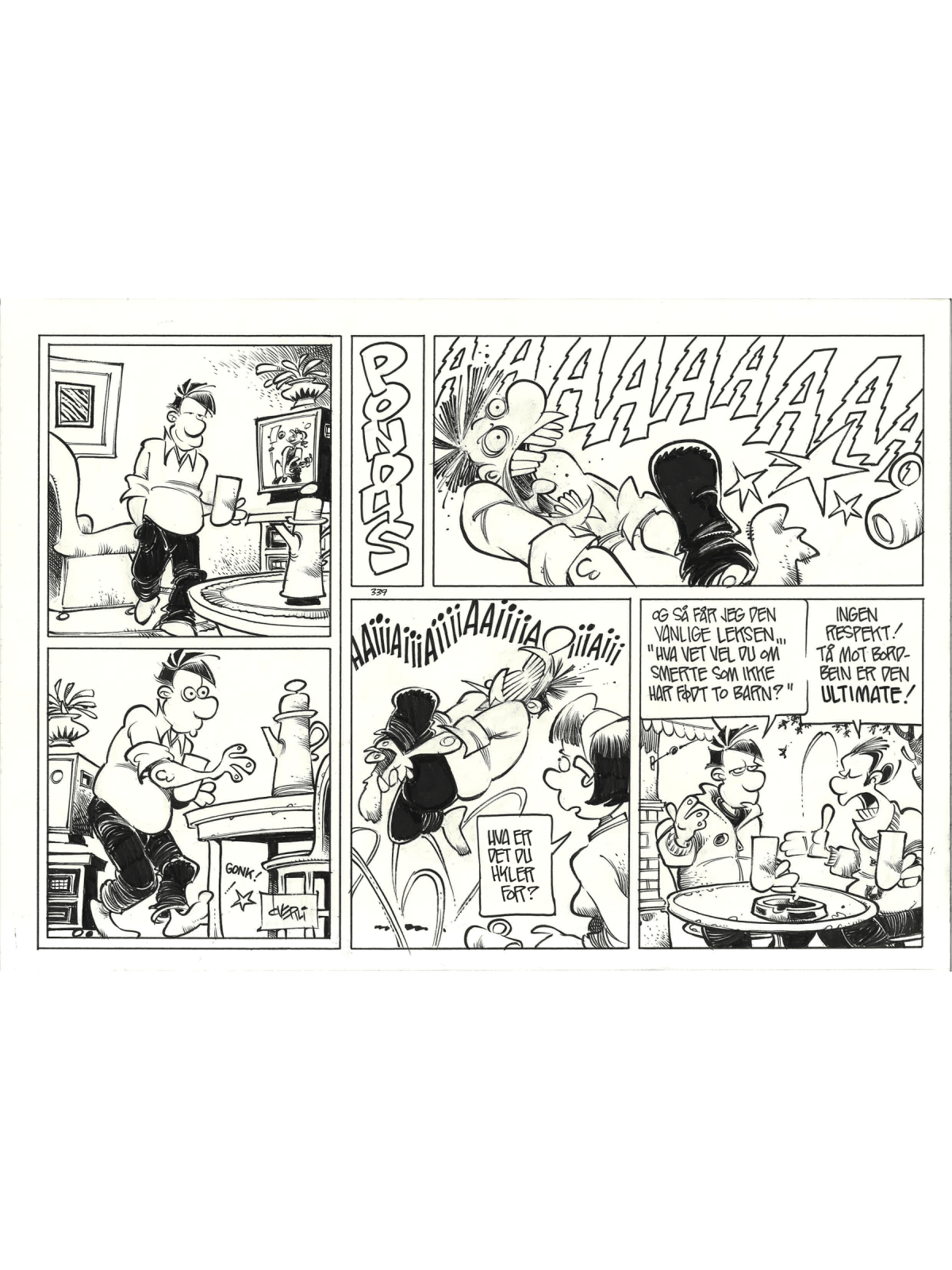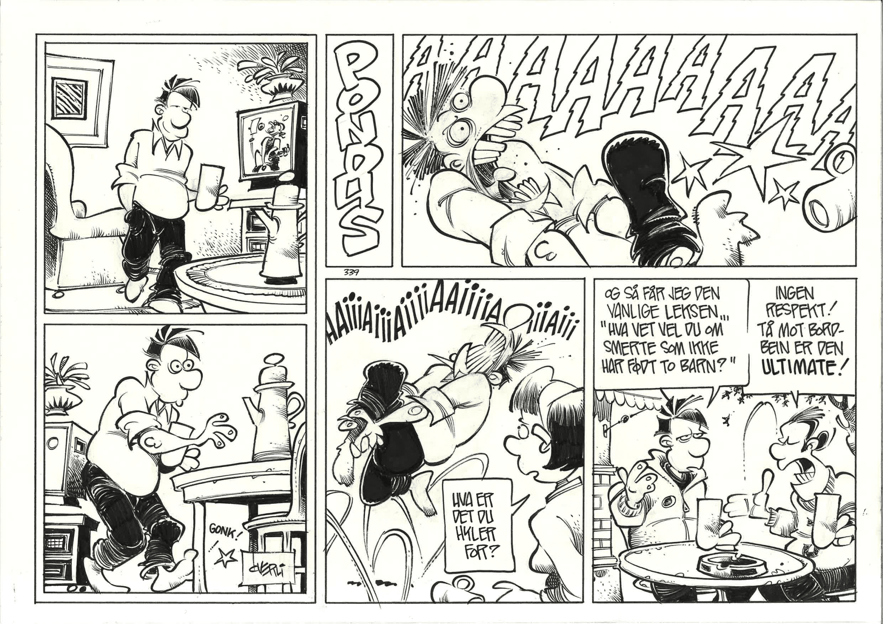 Her er godbiten «Ingen respekt», halvside nr. 339. En skikkelig klassisk Pondus-tegning i både strek og tematikk!